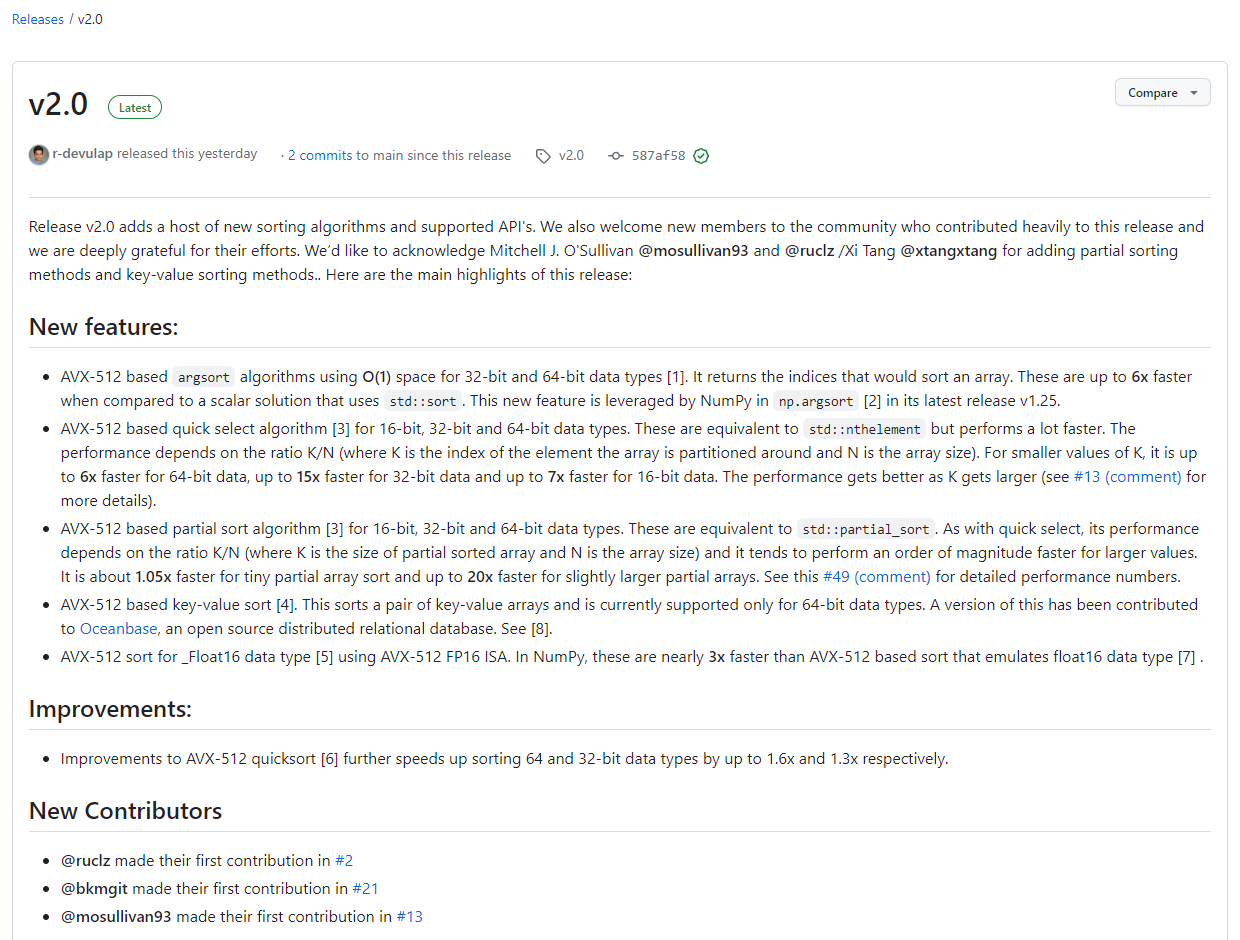 고성능 정렬에 관심이 있고 AVX-512의 성능 잠재력을 지속적으로 극대화하는 데 관심이 있는 분들은 이번 x86-simd-sort 2.0 버전의 공개에 대해 주목해볼만 할 것 같습니다. 관련 내용이 해당 프로젝트의 Github에 공개되었는데요. x86-simd-sort 2.0의 릴리스 하이라이트는 다음과 같습니다.