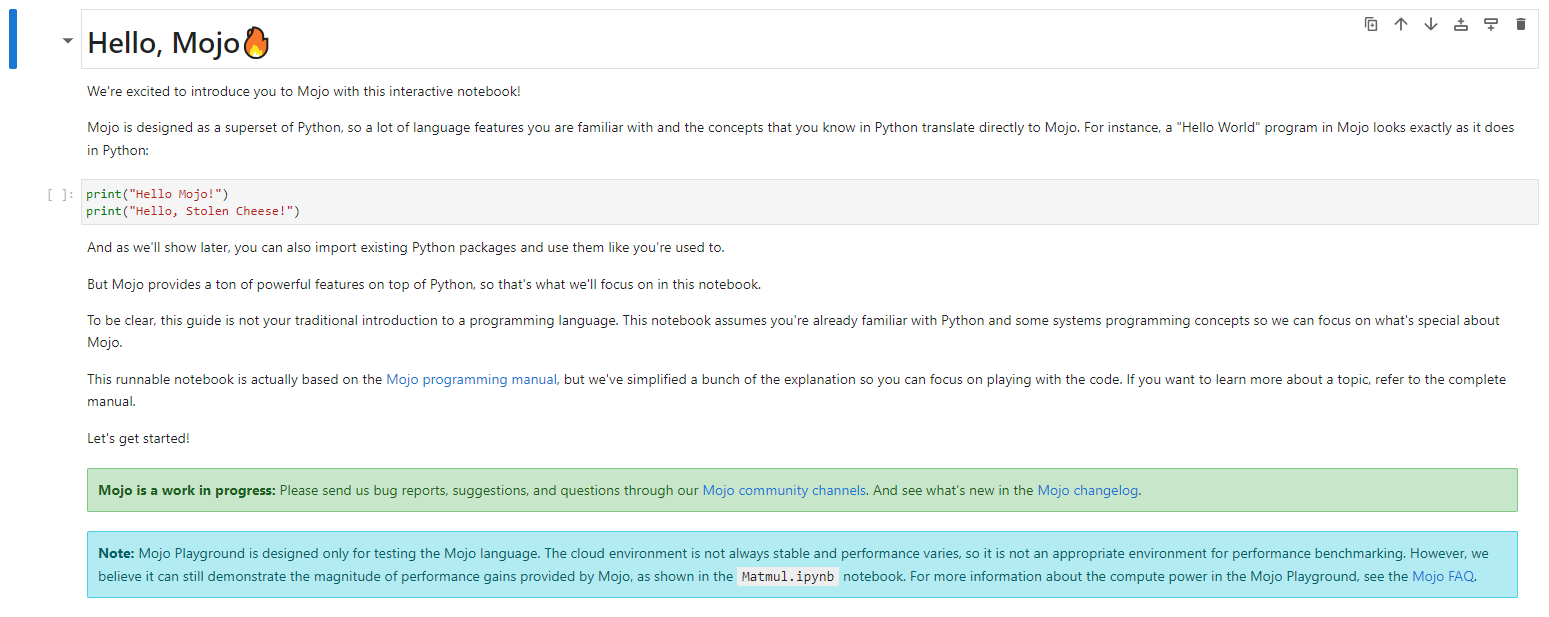 메일에서 제공되는 링크로 접속하면 위와 같이 Jupyter Lab으로 제공되는 Mojo Playground에서 Mojo를 직접 사용해 볼 수 있습니다.